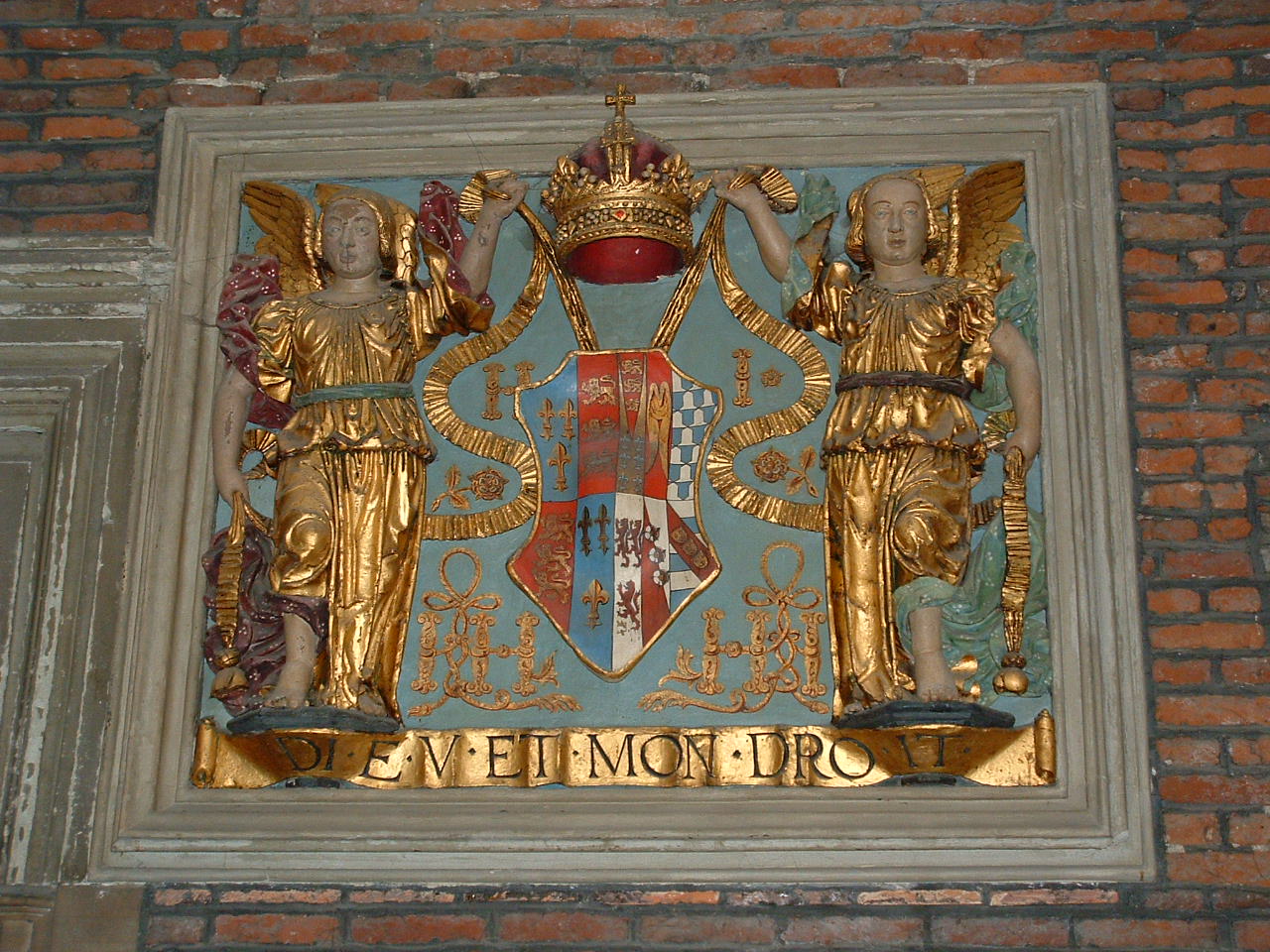 Essa foto mostra uma placa na entrada da Capela Real do palácio de Hampton Court, na Inglaterra. A placa combina o conjunto de armas de Henrique VIII com Jane Seymour, adornada por anjos sob uma coroa de ouro e rosas Tudor, como o lema de Henrique na parte inferior. Logo acima do lema e de cada lado do escudo, estão suas iniciais “H” e “I” entrelaçadas em românticos nós. (O ‘’I’’ é a inicial de Iana ou Iohanna – Jane em latim).