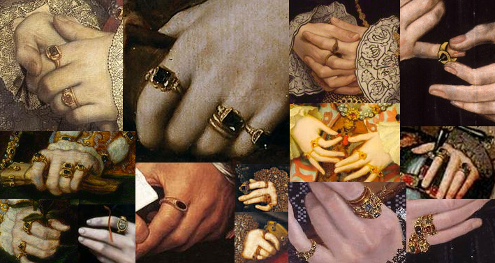 Anéis – Anéis usados pelos ricos Tudors incluíam anéis de luto, com brasões para selar cartas, solitários, estilo chuveiro e definidos com joias como ônix, safira, pérolas e rubis.