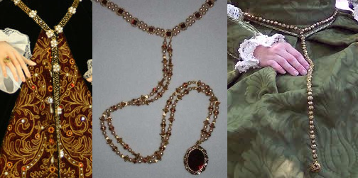Colares – Colares podiam ser feitos de pérolas (como o famoso colar com o pingente B de Bolena), ou de ouro ou prata com pedras preciosas incrustadas, como no retrato da princesa Elizabeth. Colares nos tempos Tudor também eram conhecidos como “carcanets” e tendiam a ser colares estilo gargantilhas. Outros colares incluíam cordões que poderiam ser presos ao pescoço de diferentes maneiras como por broche ou alfinete. As correntes feminina costumavam ser de um estilo bem rebuscado.