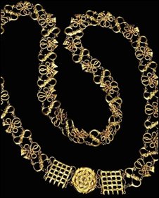 Correntes douradas eram populares na corte e os homens tendiam a usá-las como forma de refletir seus status. Você deve ter visto as correntes de estado que Sir Thomas More, Thomas Cromwell e Henrique VIII usavam em “The Tudors” e as que aparecem em seus retratos. Correntes especiais de ofício eram incluídas para a Ordem da Jarreteira, a Ordem do tosão de ouro e o Collar of Esses. Correntes douradas também eram populares presentes de casamento para mulheres. Correntes de ouro falsas, conhecidas como “St Martin’s Chain”, eram bastante comuns. O nome veio do fato de que os joalheiros que faziam as joias falsas tinham direitos antigos sob o santuário na freguesia de St Martin Le Grand e podiam trabalhar sem temerem infligirem os regulamentos da Companhia dos Ourives.