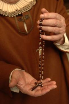 Rosários – Rosários ou terços eram colares de contas usados por católicos para contagem das orações. Eles podiam ser simples contas de vidro colorido, ou até mesmo pedras preciosas. Elizabeth I proibiu os rosários em 1571, mas os católicos passaram a usar anéis de rosários, que continham 10 pinos de orações.