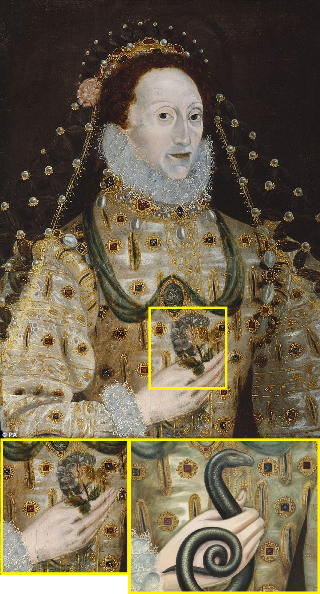 Tempos atrás veio à luz uma notícia que deixou muitos historiadores de arte atônitos. Durante anos, experts no assunto especularam sobre uma misteriosa sombra que cobria um dos retratos de Elizabeth, uma mancha negra que enfim descobriram tratar-se de uma serpente. O artista anônimo que pintou a “Rainha Virgem” desenhou o réptil enroscado na mão da monarca, mas apagou-a substituindo pela convencional rosa Tudor, dando a entender que a serpente poderia associar-se ao mal e ao pecado original na tradição bíblica.