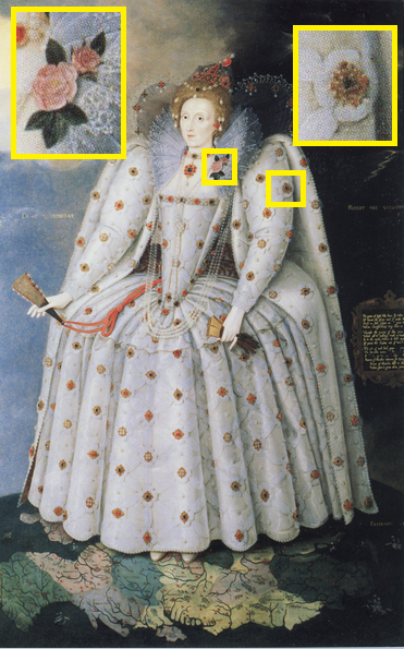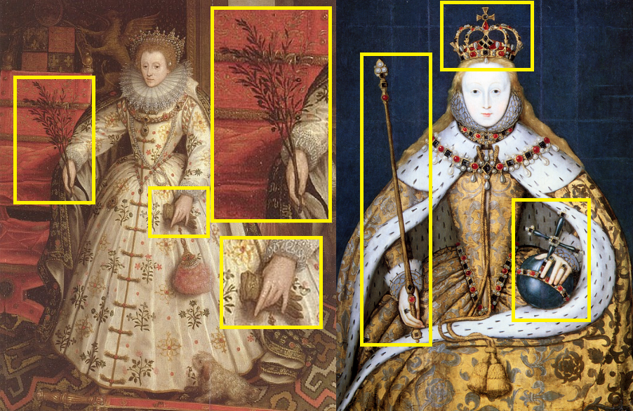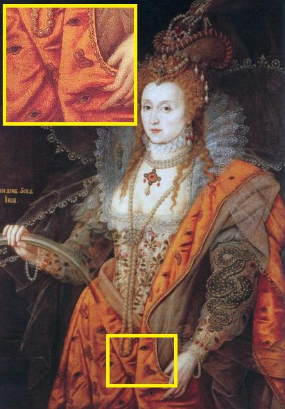 Os olhos e ouvidos representados no manto do vestido de Elizabeth simbolizavam que ela podia ver e ouvir tudo. Podiam também simbolizar a figura de Elizabeth que estava ficando famosa pelos cantos do mundo, onde todos a viam ou ouviam falar dela.
