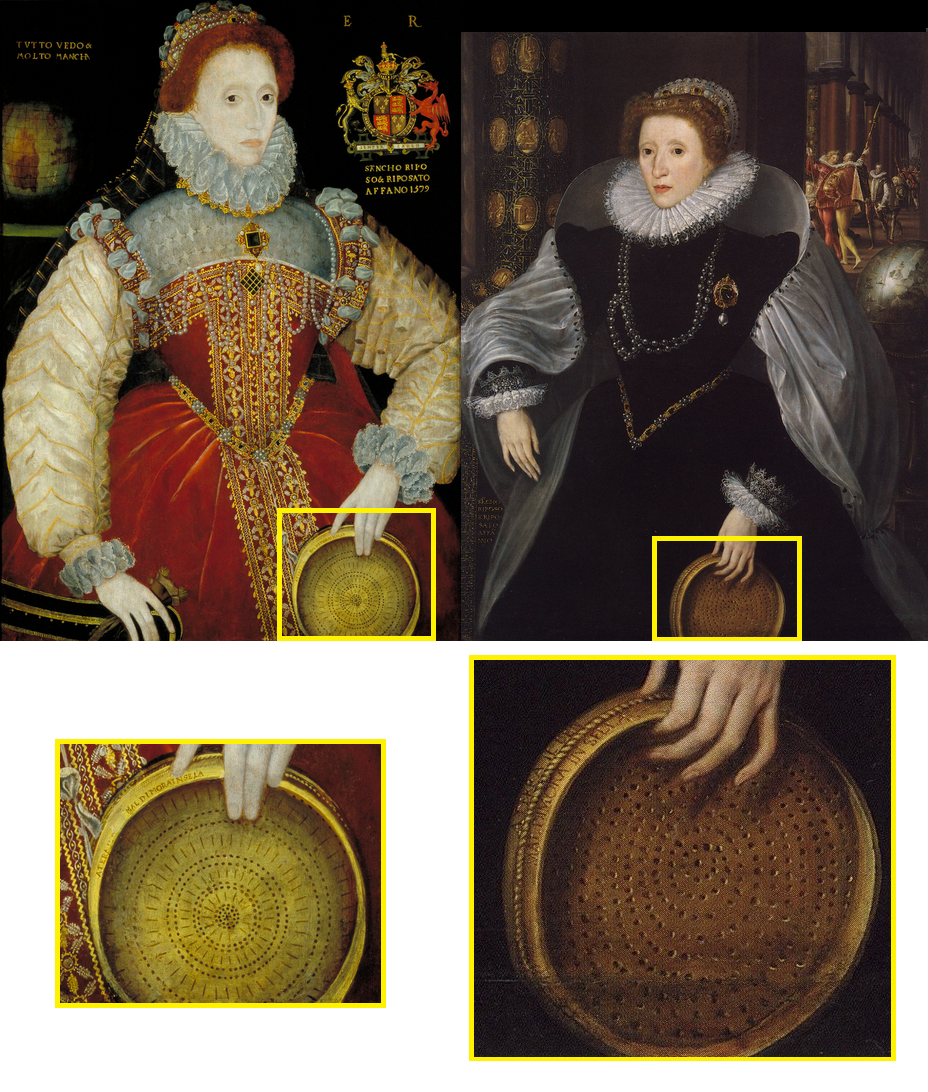 A peneira é um símbolo que remonta a Roma antiga, onde a virgem Tuccia, supostamente demonstrou suas pureza transportando água por uma peneira sem derramar uma só gota. Este símbolo foi usado para glorificar a virgindade de Elizabeth e associar a Inglaterra ao outrora poderoso império Romano. (Para melhor visualização, clique na imagem)