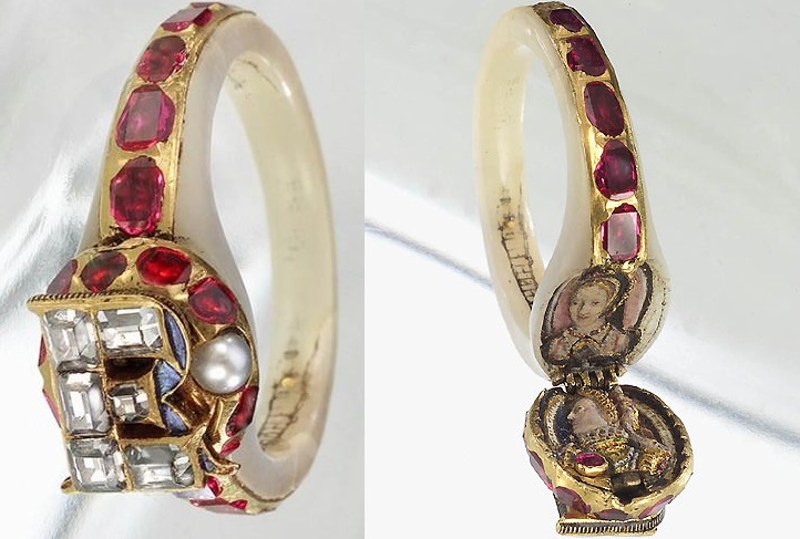 O anel foi encomendado pela rainha em 1575. Trata-se de uma peça de ouro, coberta de diamantes que formam a letra “E”, para Elizabeth, e abaixo do ”E”, a letra “R” de Regina (Rainha em latim), em esmalte azul. Porém, o mais curioso desta peça, é que ela possui um compartimento secreto que, ao abrir, revelam os bustos em relevo pintado de duas mulheres, ela e provavelmente sua mãe, lado a lado.