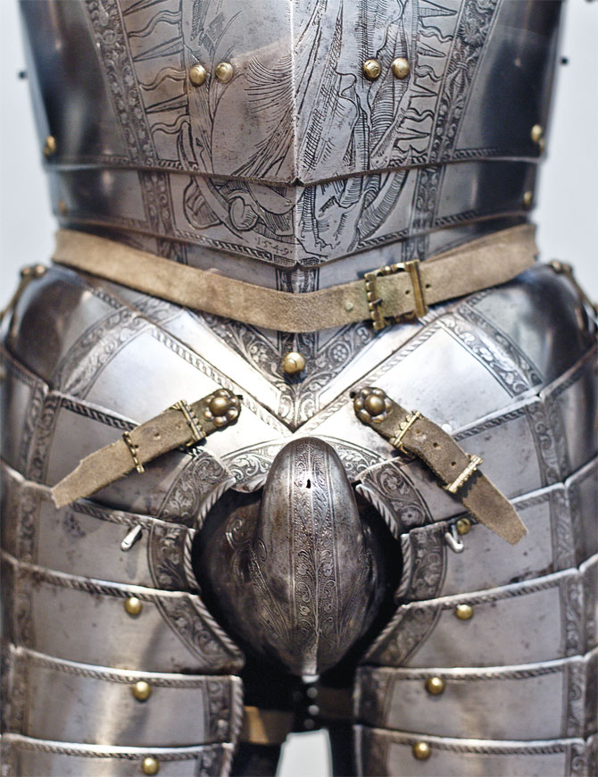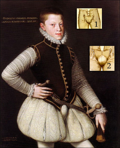 “O codpiece foi exagerado em tamanho, a bolsa foi aumentada, reduzida e até mesmo ornamentada com broches ou jóias.”