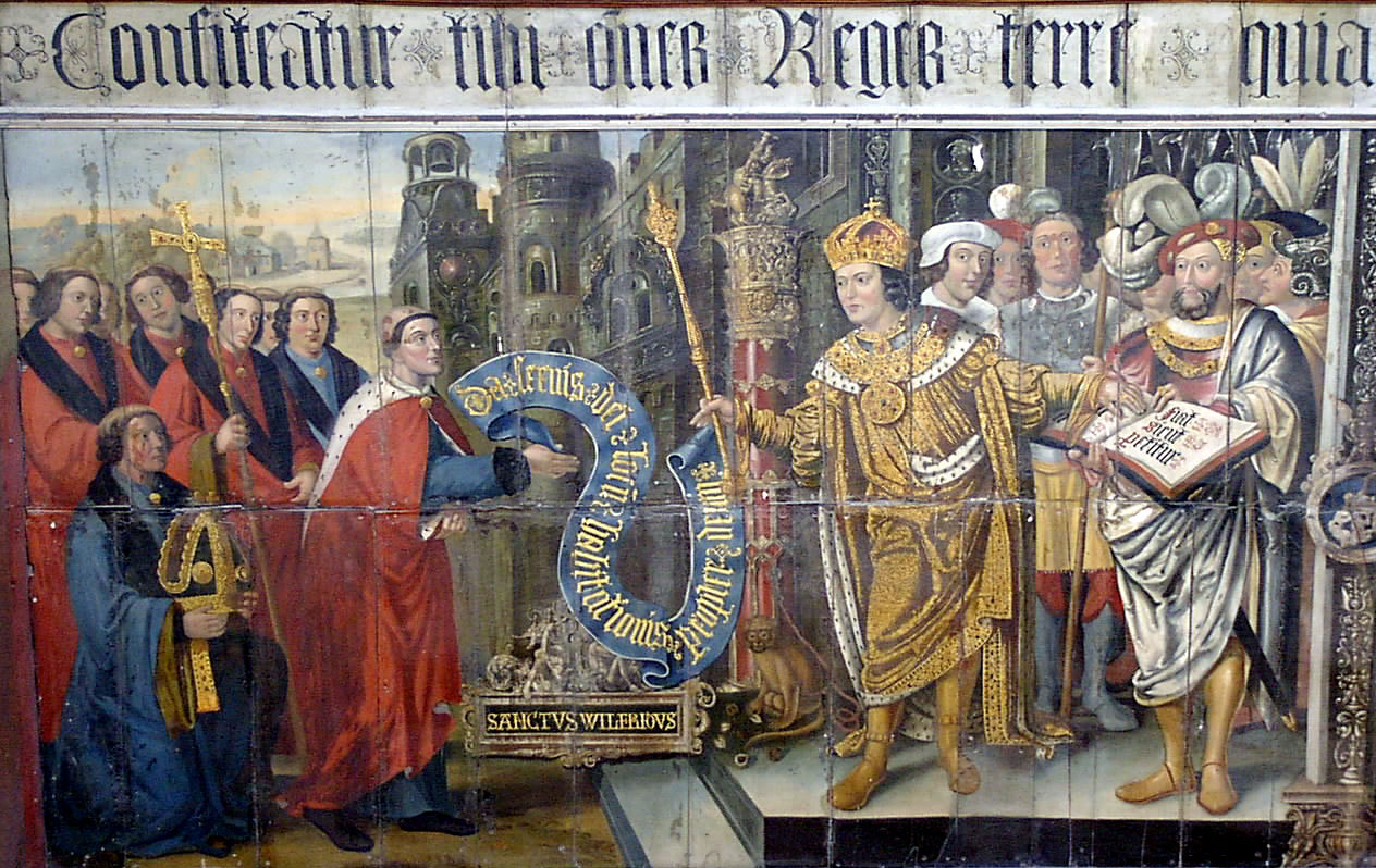 No painel da esquerda, é representada uma alegoria do século VII, sobre um rei saxão e bispo fundador desta catedral; no painel da direita, aparece Henrique VIII em meio a uma multidão, juntamente com o bispo Robert Sherborne, homem que encomendou a pintura, no início da década de 1530.