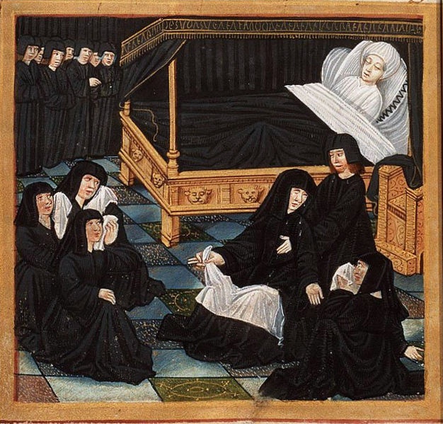 Captura de Tela 2015-06-24 às 19.53.38No quarto dia do mês de Agosto, foi a Missa de Réquiem para minha senhora Princesa de Cleves e filha do Duque de Cleves. E lá meu senhor abade de Westminster, proferiu um formoso sermão como sempre fora feito, e em seguida, o bispo de Londres cantou a missa em sua mitra. Depois da missa, meu senhor bispo e meu senhor abade, incensaram o cadáver. Depois disto, ela foi levada para seu túmulo, onde ficou envolta em tecido de ouro. Então, todos os seus oficiais-chefes, quebraram seus mastros e seus guardiões, suas varas (simbolizando o final de seu emprego para com sua senhora) e as jogaram dentro de seu túmulo, e cobriram seu cadáver com tecido negro. Todos os senhores e senhoras, cavaleiros, cavalheiros e damas, fizeram fizeram sua oferta (de flores). E depois da missa, um grande jantar (foi realizado) para meus senhores. E minha Senhora de Winchester, fora a chefe enlutada. Meu senhor, o Lord Darcy, seguiu Lady Winchester para todos os lados. E assim, eles foram jantar.