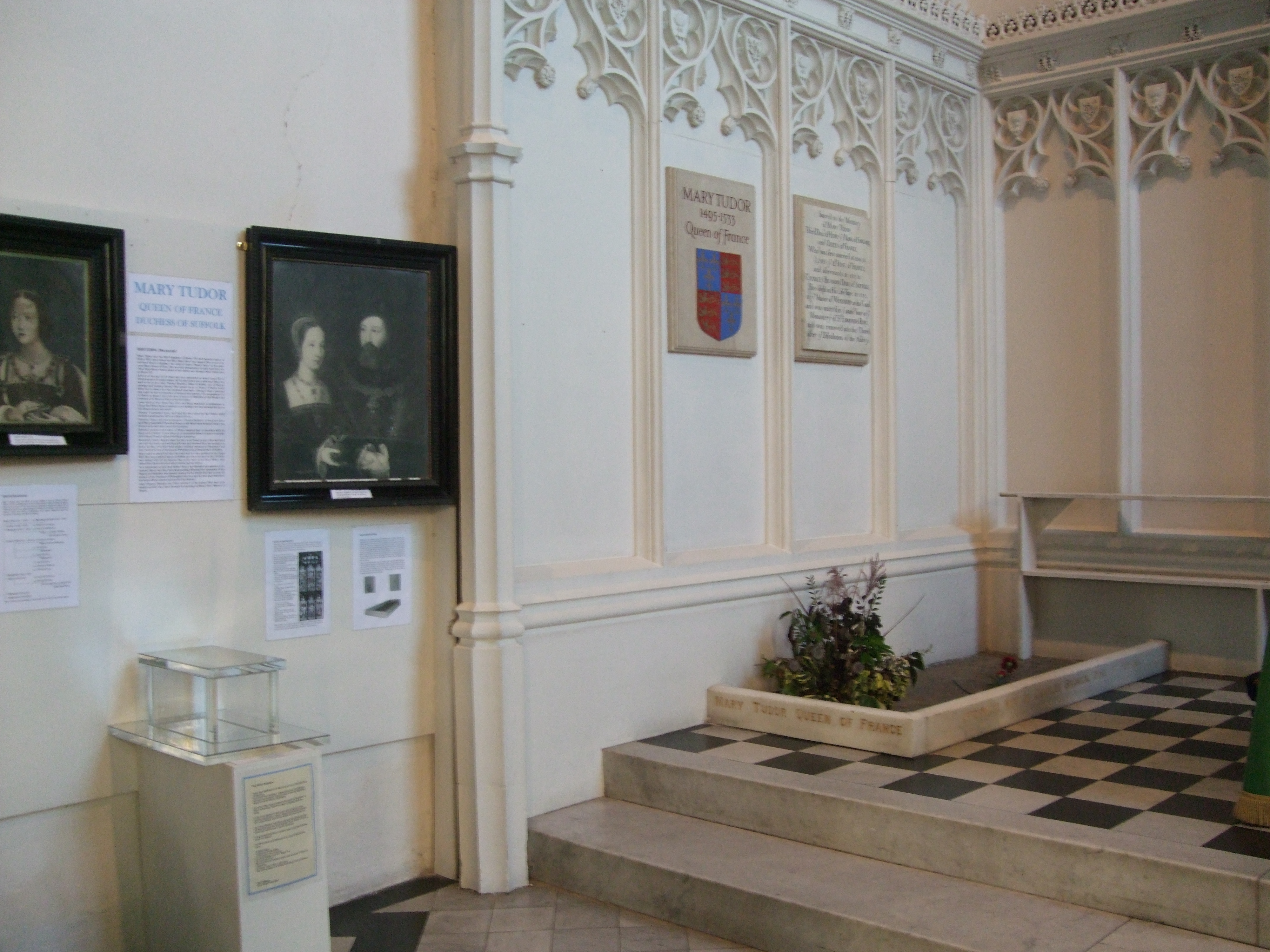 ”Sagrado a memória de Mary Tudor, terceira filha de Henrique VII – Rei da Inglaterra, e Rainha da França; que casou-se em 1514, com Luís XII – Rei de França e depois, em 1517, com Charles Brandon – Duque de Suffolk. Ela morreu durante a vida dele, em 1533, na mansão de Westhorp. Ela foi enterrada neste mesmo ano, no Mosteiro de St. Edmund’s e depois removida para esta igreja, após a dissolução da Abadia”.