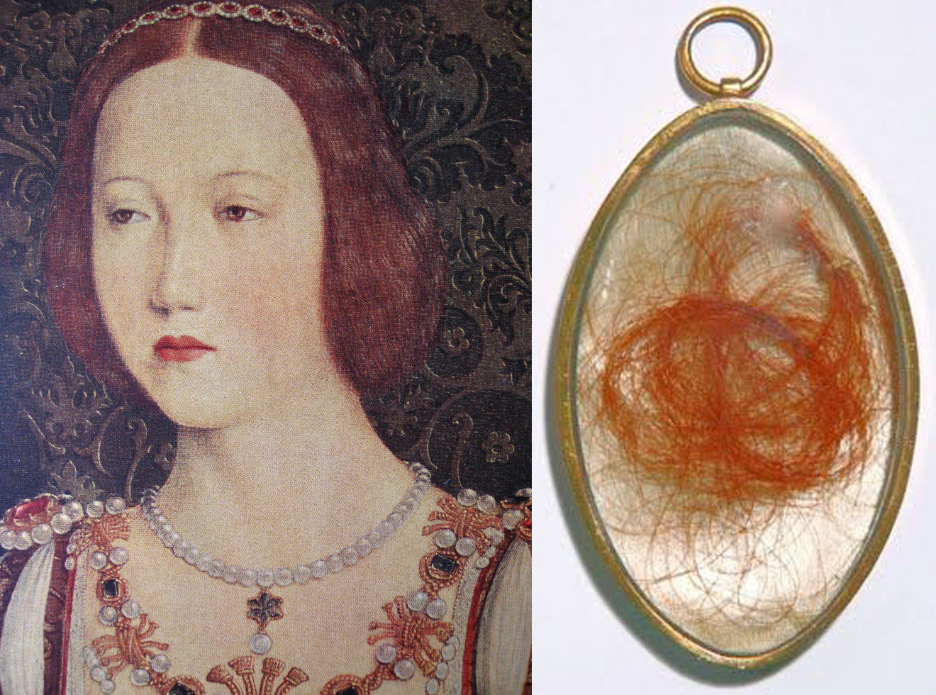 ”Esta interessante relíquia, é uma mecha de cabelo retirada do cadáver de Maria Tudor – filha mais nova de Henrique VII e Rainha de Luís XII da França. Quando seu caixão foi aberto: “Sir John Cullum, que era uma das partes presentes quando o corpo foi exumado, entregou a mecha à Duquesa viúva de Portland. Na venda de sua coleção, em 1786, ela foi comprada pelo último Duque de Chandos “O próprio descendente da princesa, por seu subseqüente casamento com Charles Brandon – Duque de Suffolk.”. A mecha de cabelo, que tem bem mais de 30 centímetros de comprimento, e de belíssima cor dourada brilhante, foi fechada em uma caixa de vidro. Esta aquisição exerceu considerável interesse a Putkny, porém foi adquirida por Sr. Owen, no dia 6 de setembro de 1848. O primeiro lance foi contudo, muito baixo e poucos apareceram para adquiri-la por 20 xillings, o montante adquirido anos antes”.